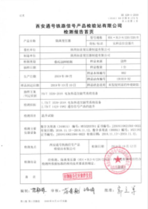 依照新鐵標(biāo)TB/T3539-2018標(biāo)準(zhǔn),公司委托西安通號鐵路信號產(chǎn)品檢驗站,對公司生產(chǎn)RD1型、RDD型、RDD1型、BD型、TYDR型隔離變做第三方檢測。常溫性能實驗(容量、效率、空載電流、瞬態(tài)特性、絕緣電阻、絕緣耐壓、斷路器、接線端子、外觀),防塵放水試驗,震動試驗,溫升試驗等檢測,達(dá)到行業(yè)標(biāo)準(zhǔn)。(附檢測報告)