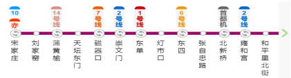 據2020年10月北京地鐵官網顯示,北京地鐵5號線呈南北走向,線路位于城市中軸線東側,南北向連接豐臺、東城、朝陽、昌平4個區 。